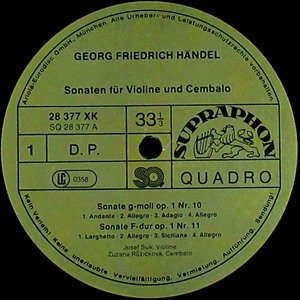 中古レコード/弦楽器奏者 ヘンデル:ヴァイオリン・ソナタ集 28379 ヨーゼフ・スーク(Vn) ルージチコヴァ(Cem) 4,400円(税込) 独EURODISC/SUPRAPHON 28 379 XDK (2LP) STEREO 中古LP 盤質A/ジャケットA 金/黒文字 レーベル <収録曲目> Op.1 – No.3、6、10、11、12、13、14、15、16 German Original Label