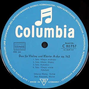 中古レコード/弦楽器奏者 シューベルト:ヴァイオリン・ソナタ(デュオ)、ロンド・ブリランテ C80757 ヨハンナ・マルツィ(Vn) アントニエッティ(P) 55,000円(税込) 独COLUMBIA C 80757 MONO 中古LP 盤質A/ジャケットA 水色 レーベル German Original Label