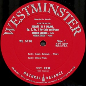 中古レコード/弦楽器奏者 ベートーヴェン:チェロ・ソナタNo.1&No.2 WL5170 アントニオ・ヤニグロ(Vc) カルロ・ゼッキ(P) 16,500円(税込) 米WESTMINSTER WL 5170 MONO 中古LP 盤質A/ジャケットA- 赤/銀文字 レーベル ラミネート浮き少々 ORIGINAL LABEL