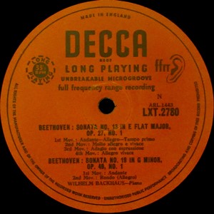 中古レコード/ピアニスト ベートーヴェン:ピアノソナタNo.13、19、14「月光」、20 LXT2780 ウィルヘルム・バックハウス(P) 8,800円(税込) 英DECCA LXT 2780 MONO 中古LP 盤質A/ジャケットA オレンジ/金文字 フラット盤 内溝 ORIGINAL LABEL