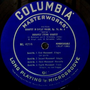 中古レコード/器楽奏者/室内楽 ハイドン:弦楽四重奏曲op.64-5「ひばり」&op.76-4「日の出」 ML4216 ブダペスト弦楽四重奏団 5,500円(税込) 米COLUMBIA ML 4216 MONO 中古LP 盤質A/ジャケットA 青/銀文字 レーベル フラット盤 ORIGINAL LABEL