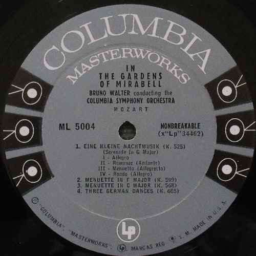 中古レコード/指揮者/オーケストラ ミラベルの庭園にて ワルター ML5004 ブルーノ・ワルター/コロムビアSO 7,700円(税込) 米COLUMBIA ML 5004 MONO 中古LP 盤質A/ジャケットA 6 eyes レーベル <収録曲目> モーツァルト: アイネ・クライネ・ナハト・ムジーク メヌエット K.599 & K.568 フリーメイソンの葬送音楽 魔笛序曲 フィガロの結婚序曲 コシ・ファン・トゥッテ序曲 劇場支配人序曲 ORIGINAL LABEL